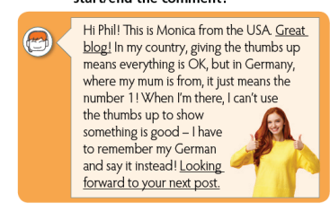 Hi Phil! This is Monica from the USA. Great blog! In my country, giving the thumbs up means everything is OK, but in Germany, where my mum is from, it just means the number 1! When I’m there, I can’t use the thumbs up to show something is good- I have to remember my German and say it instead! Looking forward to your next post.