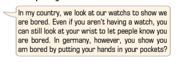 Ở đất nước tôi, chúng tôi nhìn đồng hồ để thể hiện rằng chúng tôi đang cảm thấy chán. Ngay cả khi bạn không có đồng hồ, bạn vẫn có thể nhìn vào cổ tay của mình để mọi người biết rằng bạn đang cảm thấy chán. Tuy nhiên, ở Đức, bạn có tỏ ra chán nản khi đút tay vào túi không?