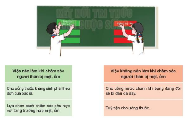 Chia sẻ thêm về kỹ năng chăm sóc người thân khi bị mệt, ốm mà em biết. Xác định việc nên, không nên làm khi chăm sóc người thân bị mệt, ốm. Thảo luận và sắm vài thể hiện cách chăm sóc người thân trong các tình huống