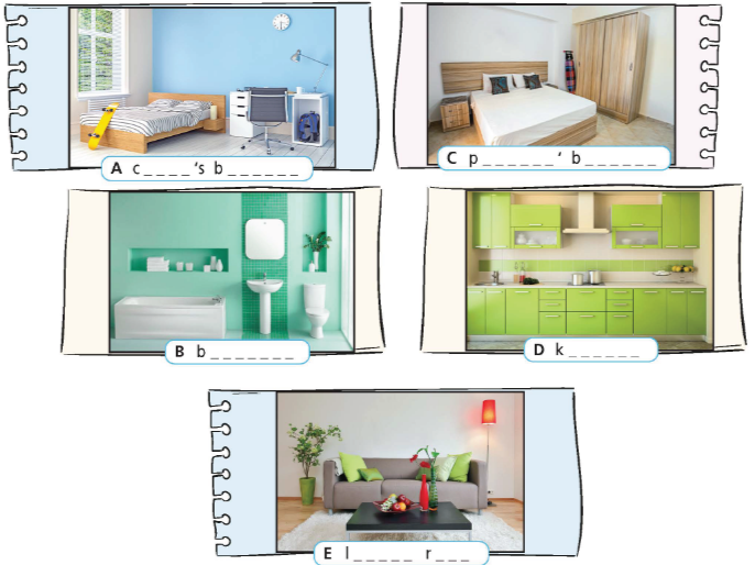 Hi everyone. My house is very big with two floors. Downstairs, there is a huge living room with a (1) sofa, a (2) coffee table, two (3) armchairs and a (4) fireplace. There is also a kitchen with lots of (5) cupboards, a (6) cooker and a (7) fridge. Upstairs, there are two bedrooms and bathrooms. My bedroom has got a great view of the (8) garden and from the (9) balcony. It’s quite big with a bed, a (10) bookcase and a desk. There’s a red (11) carpet on the floor and posters on the (12) wall. I have got my own bathroom with a pink (13) baths and a huge (14) window.