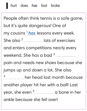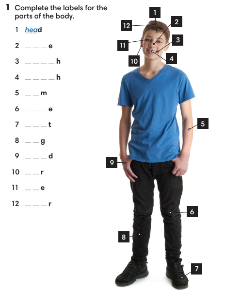 1. Complete the labels for the parts of the body. 2. Choose the correct option. 3. Complete the sentences with the correct words. 4. WORD FRIENDS: Match sentences 1-4 with pictures A-D. 5. WORD FRIENDS: Match the parts of the sentences. 6. Complete the text with the correct words.
