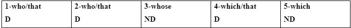 (Điền vào mỗi khoảng trống với who, which, that hoặc whose. Mệnh đề nào xác định (D)? Không xác định (ND) là gì? Sử dụng dấu phẩy nếu cần thiết.)