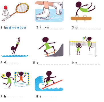 1 Look at the pictures and complete the words. 2 Read the descriptions. Write the sports. 3 WORD FRIENDS Match 1-5 with a-e to make sentences. 4 Choose the correct words to complete the sentences. 5 Complete the words in the sentences.