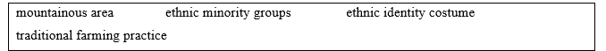 The Muờng group is considered the third largest among Việt Nam’s            with an estimated population of 1.45 million people. They usually settle down in the       of northern Việt Nam, specifically Hoà Bình Province and the mountainous districts of Thanh Hoá Province. These areas are enormous where local people use           to grow wet rice, corn and raise livestock. The Muong’s           is special, which consist of colorful tunic and headscarf. The embroidery on the dress hem and belt is the highlight of those costumes. Folk art is also an important part of their           , including folk songs, riddle songs, poems, tales, and lullabies. All of those art forms reflect the unique lifestyle and culture of the Mường group.