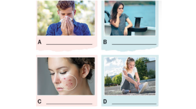 (Điền vào mỗi khoảng trống với các từ fever, acne, swollen, tender, bruised, hay fever, sunburn, aches, dizzy, sneezing, sickness, or pimples.)