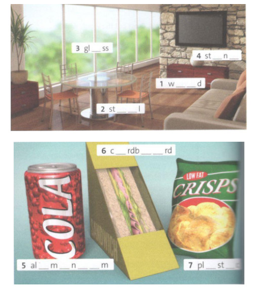 1. Complete the list of materials using a, e, i, o and u. 2. Complete the sentences with the correct materials. 3. Answer the questions with the material words from exercises 1 and 2. Use each word only once. 4. Match the words below with the diagrams. 5. Listen to the sentences and match the objects to the descriptions. Write the correct letter: A, B or C.
