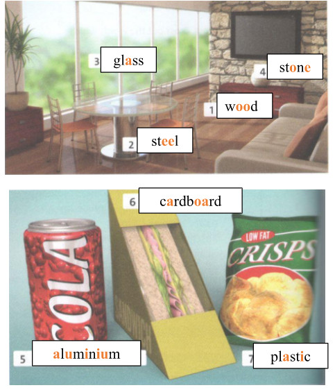 1. wood 2. steel 3. glass 4. stone 5. aluminium 6. cardboard 7. plastic