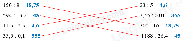 Thực hiện các phép chia rồi nối các phép tính có cùng giá trị với nhau.