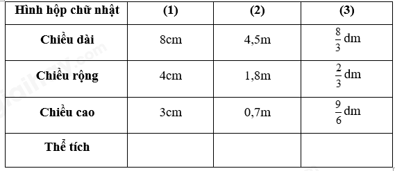 Thể tích của hình hộp chữ nhật (3) là: $\frac{8}{3} \times \frac{2}{3} \times \frac{9}{6} = \frac{8}{3}$(dm3)