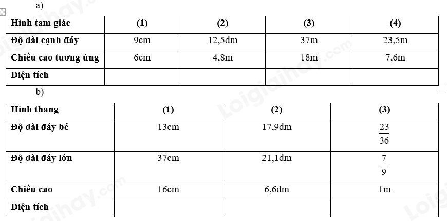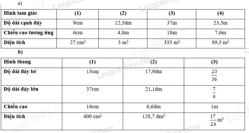 b) Diện tích hình thang bằng tổng độ dài hai đáy nhân với chiều cao (cùng một đơn vị đo) rồi chia cho 2.