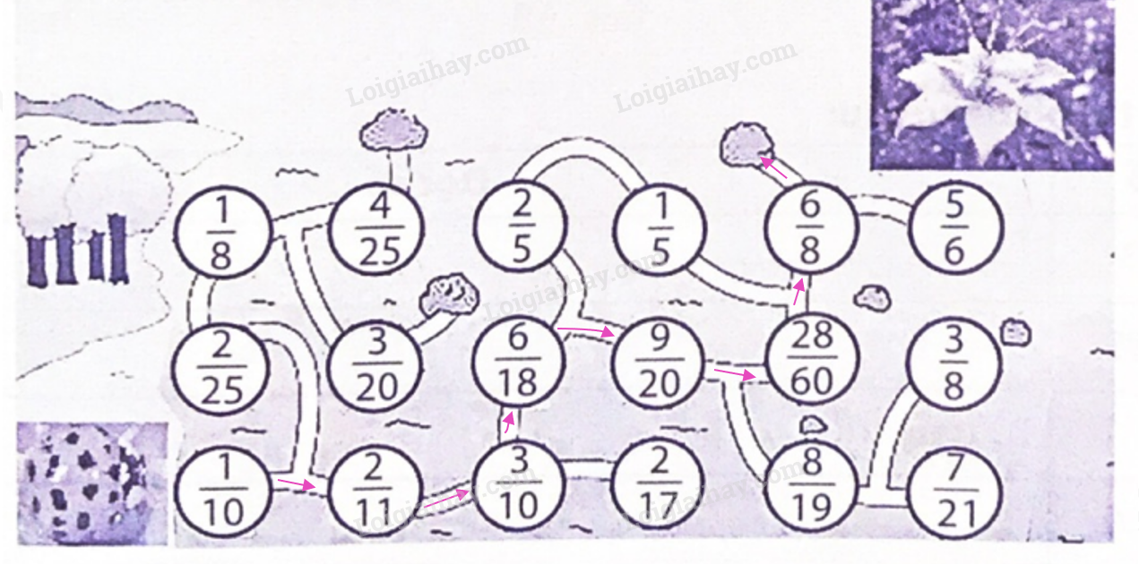 Đường về nhà của bọ rùa phải đi qua những ô có viết các phân số từ bé đến lớn. Hãy chỉ đường cho bọ rùa bằng cách tô màu vào đường đi đó.