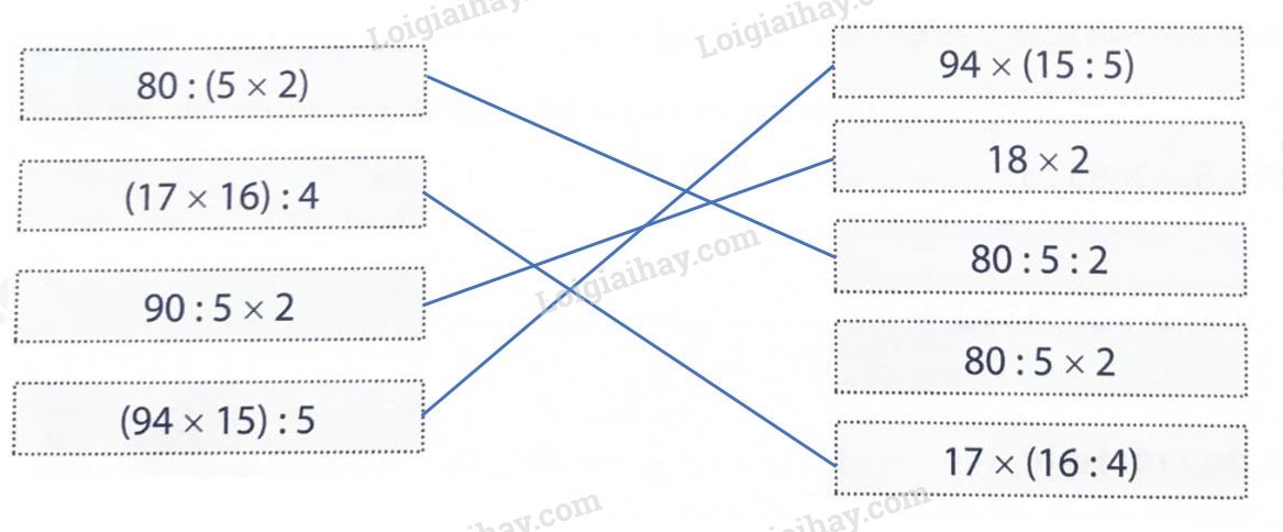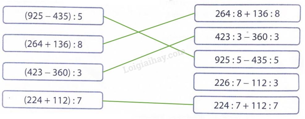 Áp dụng cách chia một số cho một tích, chia một tích cho một số rồi nối 2 biểu thức có cùng giá trị.