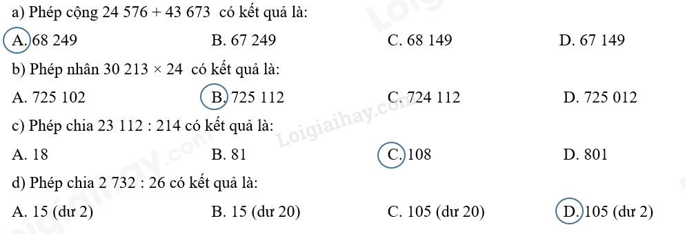 Thực hiện tính rồi chọn đáp án thích hợp.