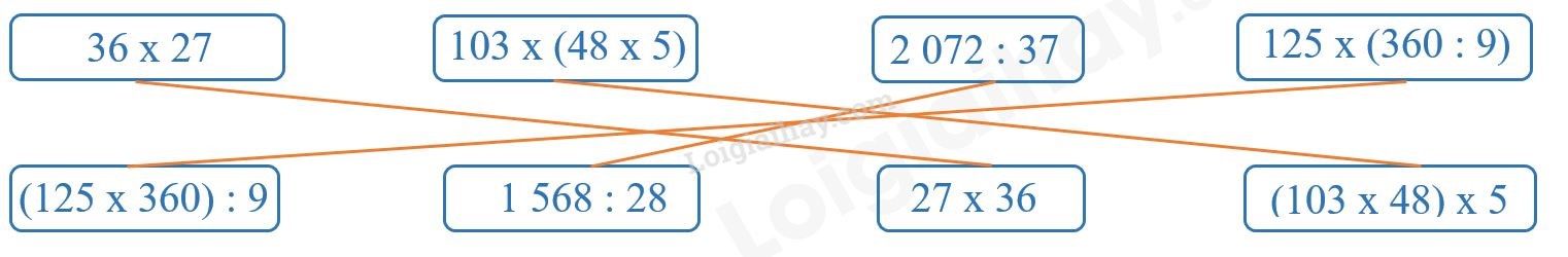 Áp dụng tính chất giao hoán, kết hợp hoặc tính giá trị mỗi biểu thức rồi nối hai phép tính có kết quả bằng nhau.