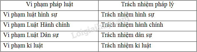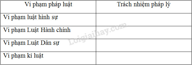 Điền vào ô trống xác định quan hệ vi phạm pháp luật với trách nhiệm pháp lí: