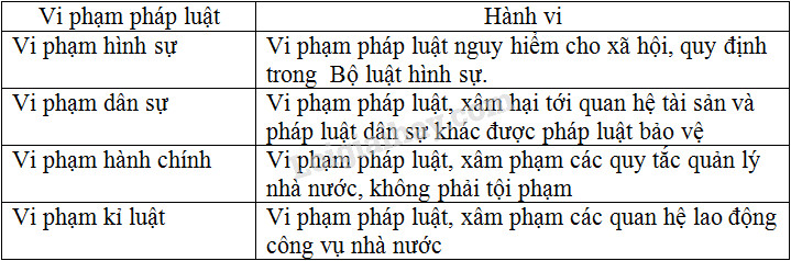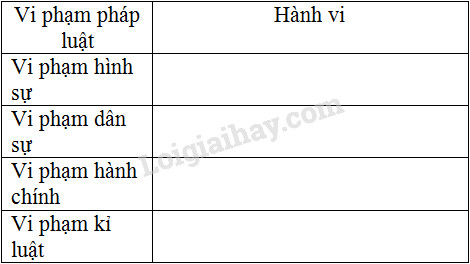Điền vào ô trống xác định hành vi vi phạm tương ứng :