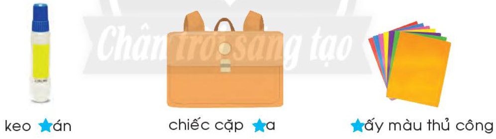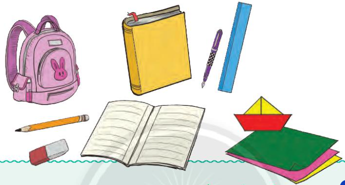 Các đồ vật trong tranh là: cặp sách, quyển sách, quyển vở, giấy màu, thuyền giấy, bút chì, bút mực, thước kẻ, cục tẩy.