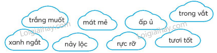 Từ ngữ chỉ đặc điểm là: trắng muốt, mát mẻ, trong vắt, xanh ngắt, rực rỡ, tươi tốt.