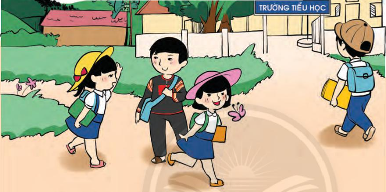 Các bạn nhỏ trong tranh đang đi đến trường học.