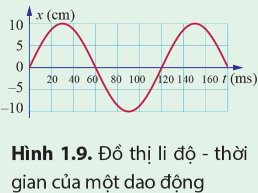 Xác định biên độ, chu kì và tần số của dao động có đồ thị li độ thời gian được biểu diễn ở Hình 1.9