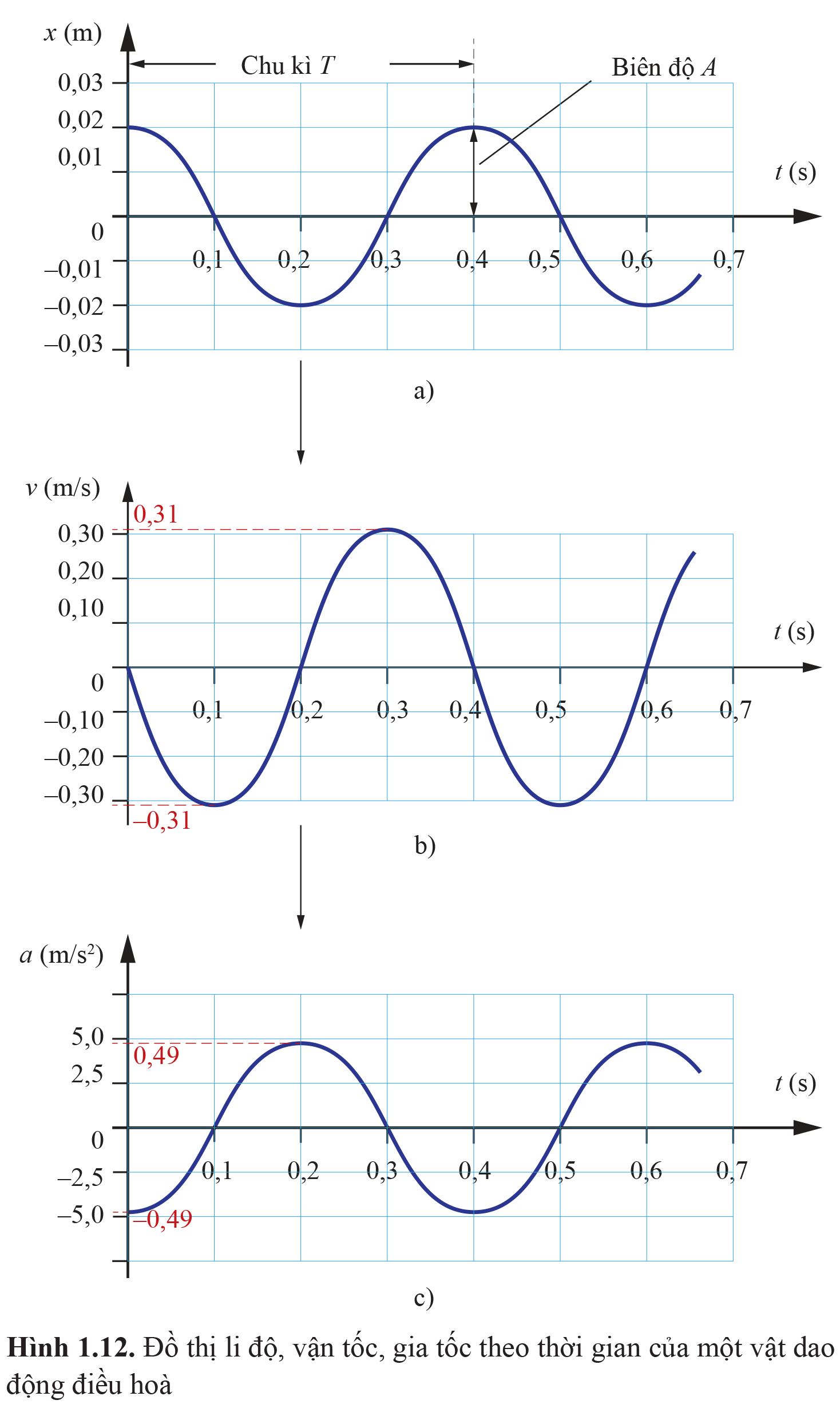 Ví dụ, trong Hình 1.12a, độ dốc của đồ thị li độ – thời gian bằng 0, vận tốc bằng 0. Khi t tăng từ 0 s đến 0,2 s, độ dốc âm, vận tốc có giá trị âm. Tại t = 0,2 s, độ dốc bằng 0 một lần nữa. Từ t = 0,2 s đến t = 0,4 s, độ dốc dương, vận tốc có giá trị dương. Độ dốc của đồ thị li độ – thời gian có độ lớn cực đại tại các thời điểm t = 0,1 s; 0,3 s; 0,5 s; …