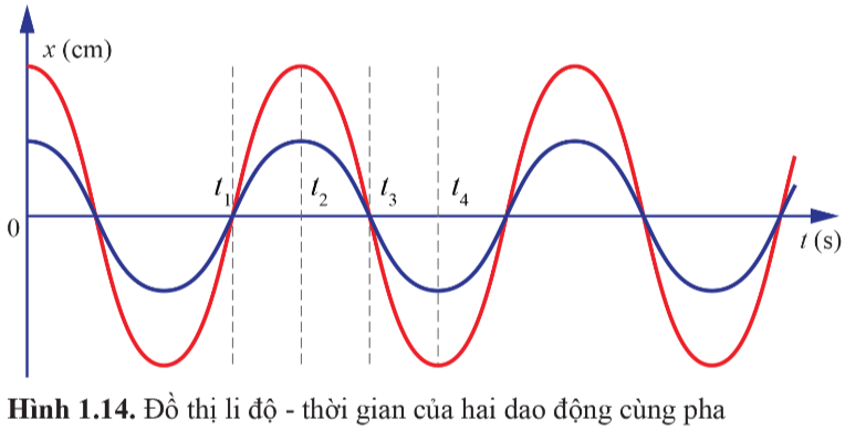 Mô tả trạng thái của hai vật dao động ở thời điểm t3 và t4 trong đồ thị Hình 1.14