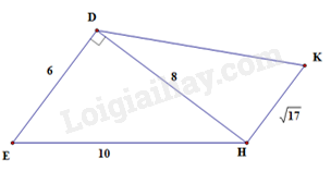 \(\begin{array}{l}D{K^2} = D{H^2} + H{K^2}\\ \Rightarrow D{K^2} = {8^2} + {\left( {\sqrt {17} } \right)^2}\\ \Rightarrow D{K^2} = 64 + 17 = 81 = {9^2}\\DK = 9\end{array}\)