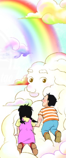 Trong giấc mơ, Nguyên thấy mình và Thảo tình cờ gặp đám mây đang nằm ngủ trên đỉnh núi. Hai bạn nhẹ nhàng leo lên và nghĩ rằng đám mây sẽ cõng mình lên trời. Đám mây thức dậy, đưa hai bạn lên tận trời xanh. Xung quanh hai bạn là những đám mây nhiều sắc màu. Gần đó, cầu vồng lung linh, rực rỡ. Cả hai reo lên, thích thú: