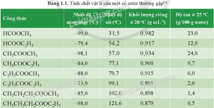 Từ các dữ liệu cho trong Bảng 1.1, hãy cho biết nhiệt độ sôi của các ester có xu hướng biến đổi theo phân tử khối như thế nào.