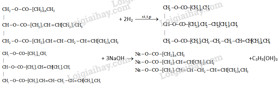 Viết phương trình hóa học của phản ứng giữa chất béo trên với hydrogen dư (xt, t, p) và với dung dịch potassium hydroxide.