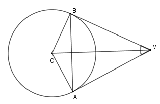 Cho hai tiếp tuyến tại $A$ và $B$ của đường tròn \(\left( O \right)\) cắt nhau tại M, biết \(\widehat {AMB} = {50^0}\) .