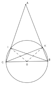 Xét các tam giác $\Delta IBC$ và .$\Delta KBC$ có $BC$ là đường kính của $\left( O \right)$ và $I;K \in \left( O \right)$