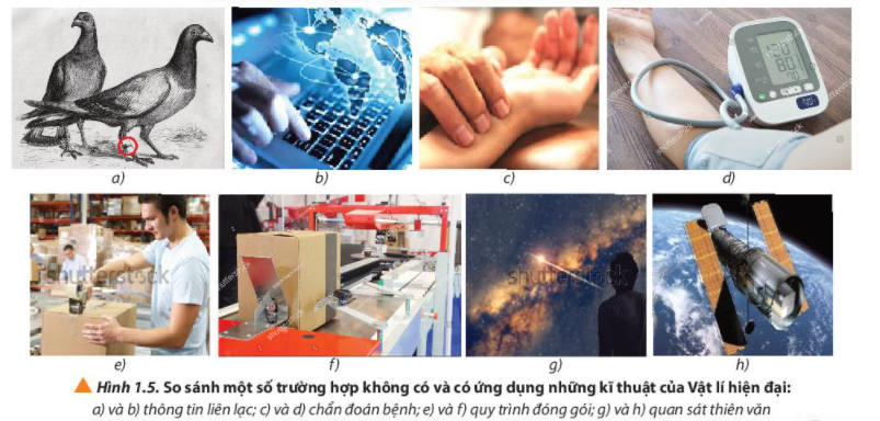 5. Quan sát Hình 1.5 và phân tích ảnh hưởng của Vật lí trong một số lĩnh vực. Từ đó, trình bày ưu điểm của việc ứng dụng Vật lí vào đời sống so với các phương pháp truyền thống ở các lĩnh vực trên.