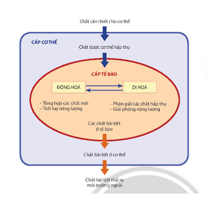 Trao đổi chất gắn liền với chuyển hóa năng lượng, được thực hiện ở cấp cơ thể cũng như cấp tế bào. Cơ thể lấy các chất cần thiết từ môi trường vào cơ thể, đồng thời thải các chất bài tiết ra ngoài. Tế bào hấp thụ các chất cần thiết từ cơ thể và thải các chất bài tiết.