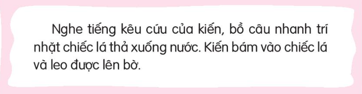 – Tranh 2: Nghe tiếng kêu cứu của kiến, bồ câu nhanh trí nhặt một chiếc lá thả xuống nước. Kiến bám vào chiếc lá và leo được lên bờ.