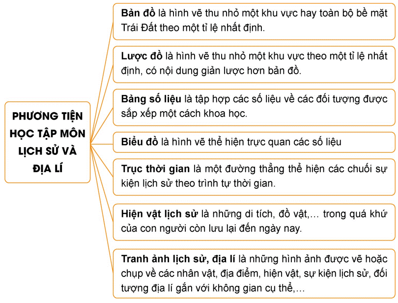 Vẽ sơ đồ tư duy thể hiện một số phương tiện học tập môn Lịch sử và Địa lí theo gợi ý hình bên.