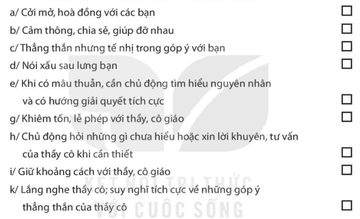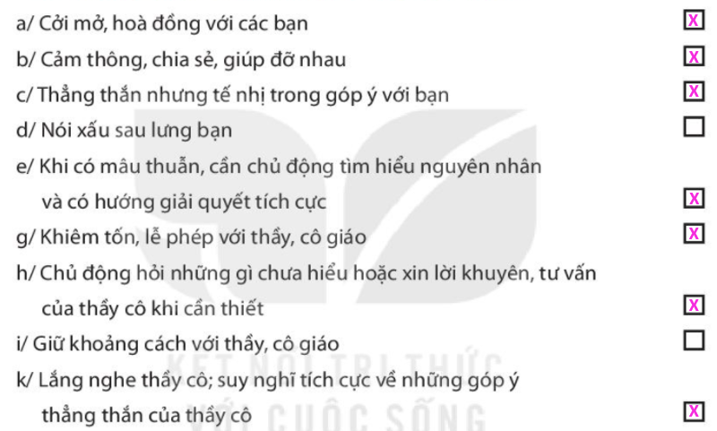 Đánh dấu X vào ô trống ở câu trả lời đúng về những việc nên làm để thiết lập quan hệ với thầy cô và bạn bè.