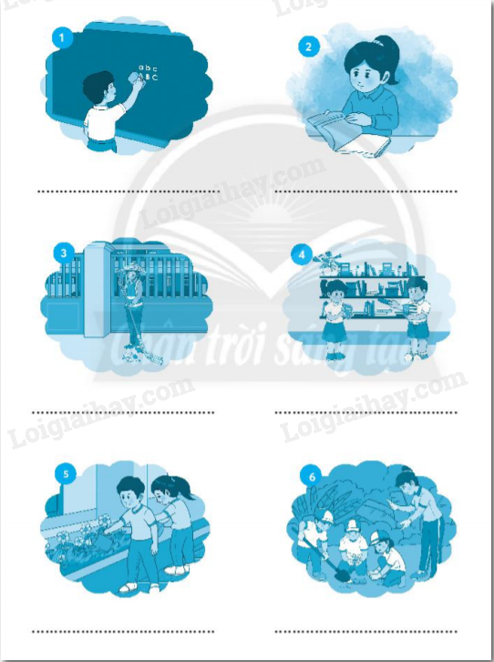 Em quan sát kĩ từng bức tranh xem các nhân vật trong tranh đang làm gì và viết lại hoạt động đó vào vở bài tập.