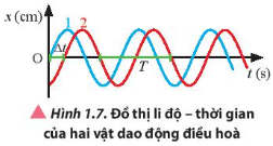 Quan sát Hình 1.7, so sánh biên độ và li độ của hai dao động 1 và 2 tại mỗi thời điểm.