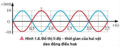 Quan sát đồ thị li độ – thời gian của hai dao động điều hòa được thể hiện trong Hình 1.8. Hãy xác định biên độ, chu kì, tần số, tần số góc của mỗi vật dao động và độ lệch pha giữa hai dao động.