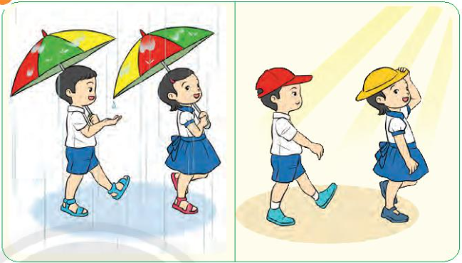 – Tranh 2: Trời nắng và các bạn nhỏ đội mũ.