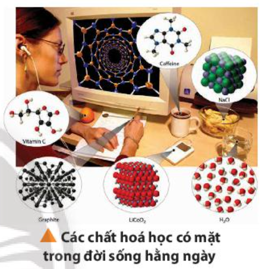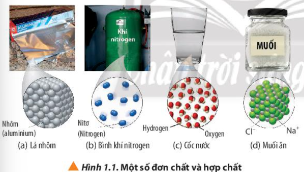 1. Quan sát Hình 1.1, hãy chỉ ra các đơn chất và hợp chất. Viết công thức hóa học của chúng