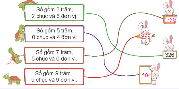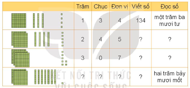 – Hàng thứ nhất, thứ hai, thứ ba: Dựa vào các số trăm, chục, đơn vị để viết số và đọc số tương ứng.