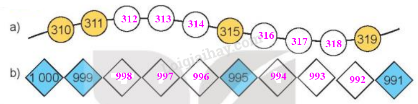 b) Tìm số ở ô có dấu ? để được ba số liên tiếp.