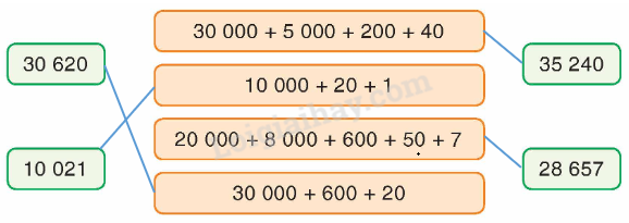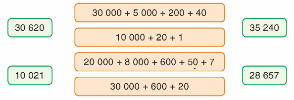 Dựa vào cách viết số thành tổng các chục nghìn, nghìn, trăm, chục, đơn vị ta nối các số với tổng thích hợp.