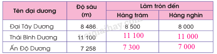 Tuấn đọc một tài liệu về biển, đại dương và biết được thông tin về độ sâu tối đa của một số đại dương như sau: