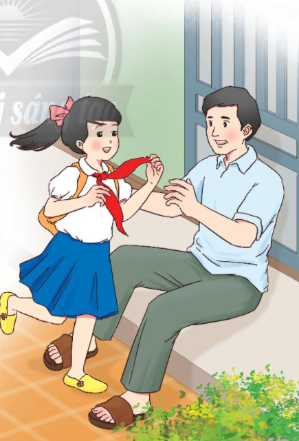Bức tranh vẽ một bạn học sinh và bố. Bạn học sinh vừa đi học về và đang khoe với bố chiếc khăn quàng đỏ trên vai mình với tâm trạng vui vẻ, hào hứng. Bố bạn nhỏ cũng rất vui mừng khi nhìn thấy con quàng chiếc khăn quàng đỏ trên vai.