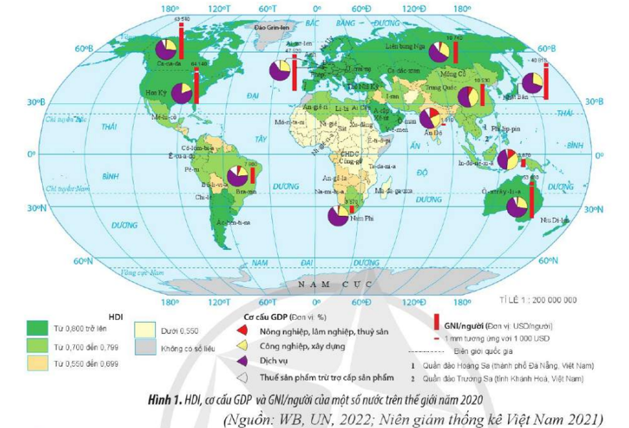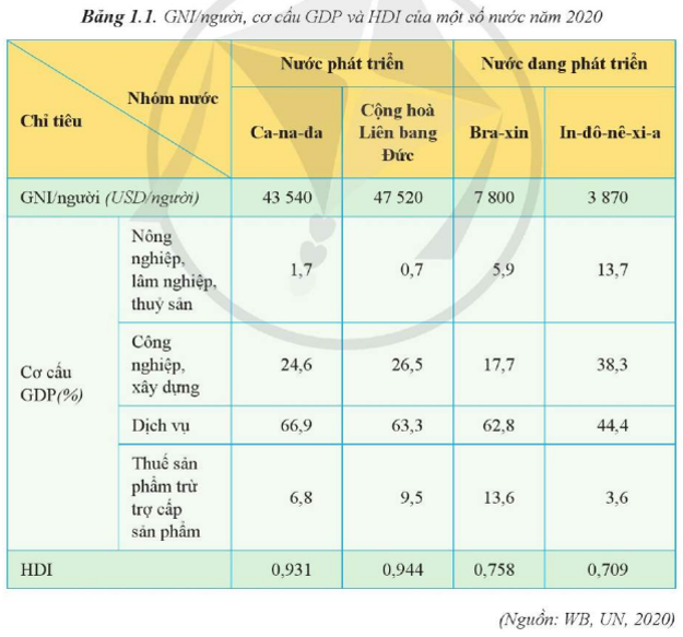 Đọc thông tin, quan sát hình 1 và dựa vào bảng 1.1, hãy: – Phân biệt các nước phát triển (Ca-na-đa, Cộng hòa Liên bang Đức) và các nước đang phát triển (Bra-xin, In-đô-nê-xi-a) về các chỉ tiêu: GNI/người, cơ cấu kinh tế và HDI). – Xác định một số nước phát triển và đang phát triển trên hình 1.1