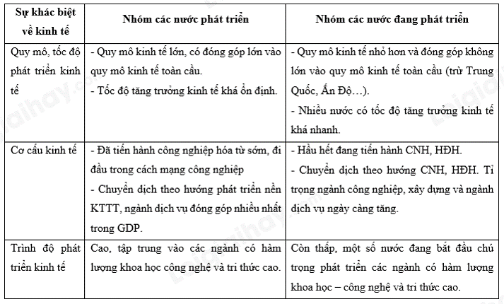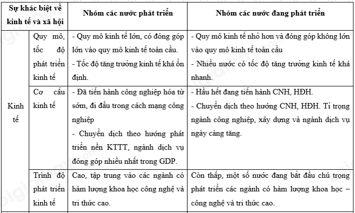 Sự khác biệt về kinh tế các nước phát triển và các nước đang phát triển được thể hiện qua quy mô, tốc độ phát triển kinh tế; cơ cấu kinh tế và trình độ phát triển kinh tế.