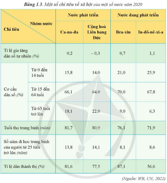 Đọc thông tin và dựa vào bảng 1.3, hãy trình bày sự khác biệt về một số khía cạnh xã hội giữa các nước phát triển và các nước đang phát triển.